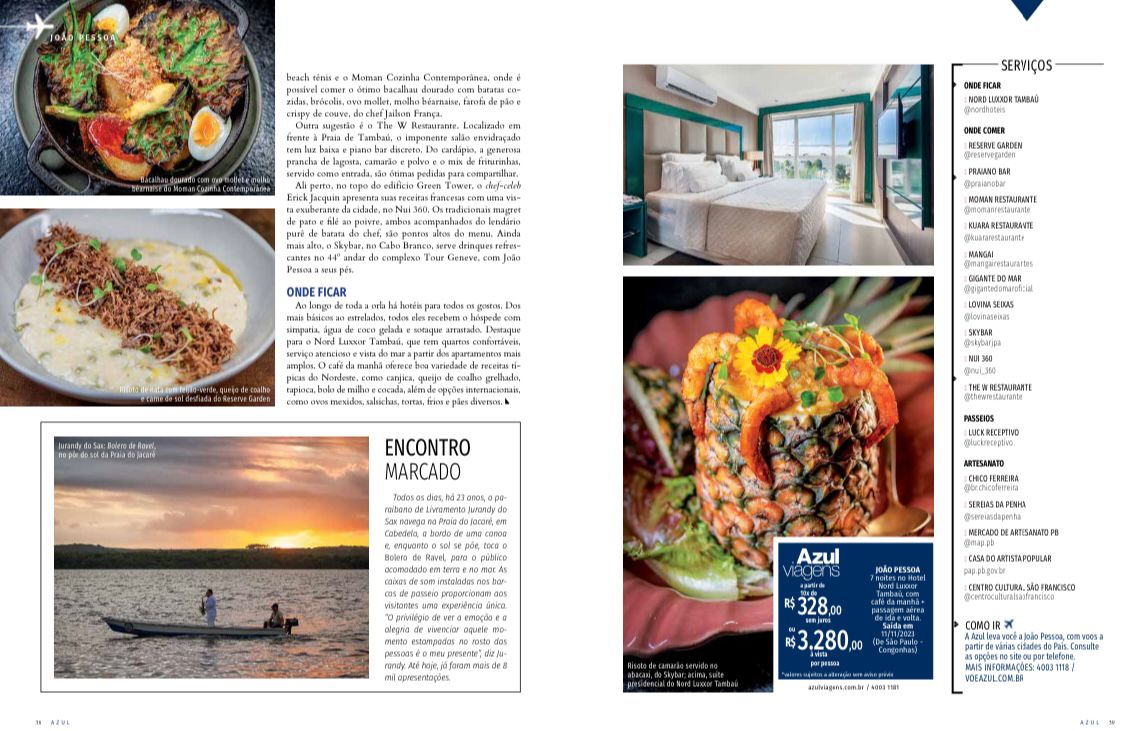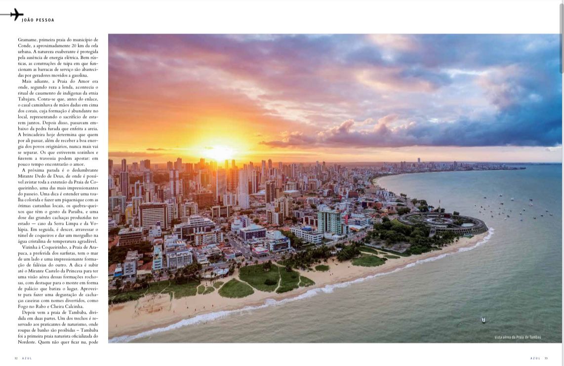 João Pessoa é destaque no cenário turístico nordestino, conforme a última edição da revista de bordo da Azul Linhas Aéreas, que circula nas aeronaves em todo o território brasileiro durante agosto. A capa da revista exibe um convite aos passageiros da companhia aérea para explorarem a capital paraibana, ao mesmo tempo que ressalta a rica oferta litorânea das cidades de Conde e Cabedelo, enriquecendo as possibilidades turísticas na Paraíba.
