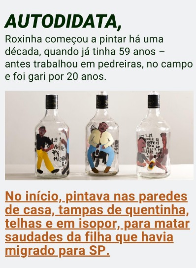 O papel logo se mostrou pequeno para tanta criatividade. Roxinha passou então a pintar nas paredes da casa, em ripas de madeira, telhas e pedaços de isopor — tudo o que estivesse ao alcance. Desse impulso espontâneo nasceu uma arte autêntica, de traços simples e narrativas cheias de emoção e humanidade.