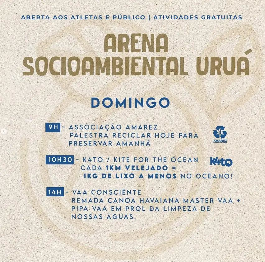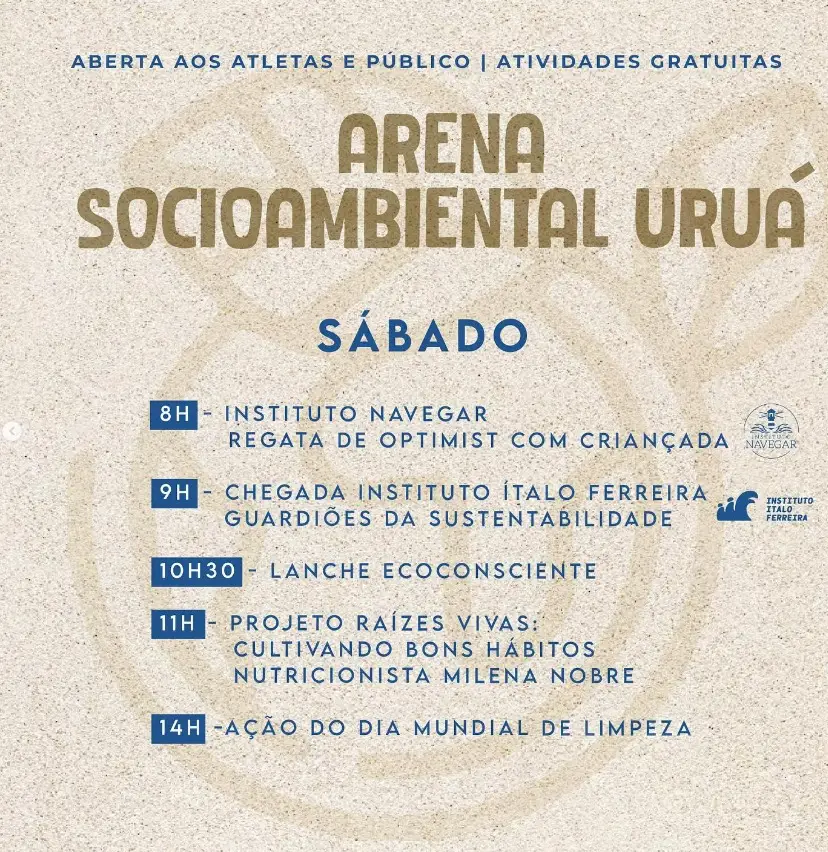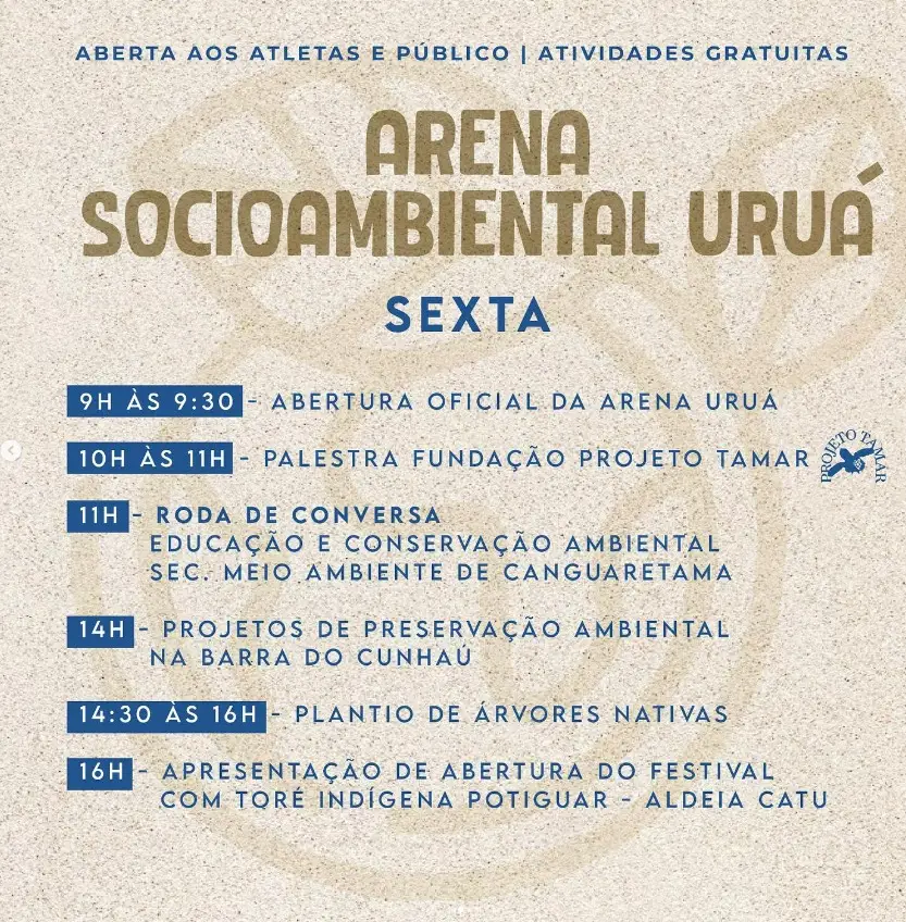 De 20 a 22 de setembro, o festival também contará com a Arena Socioambiental Uruá, um espaço aberto ao público e aos atletas, com entrada gratuita. No local, serão oferecidas palestras, oficinas, rodas de conversa e atividades voltadas para o meio ambiente, com foco em conscientização e sustentabilidade.