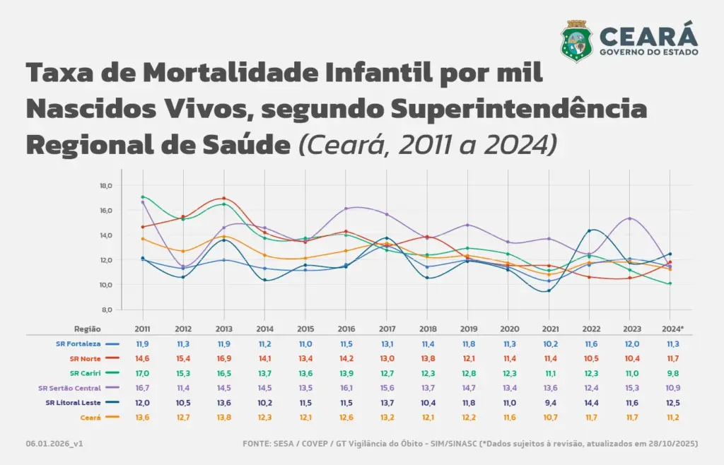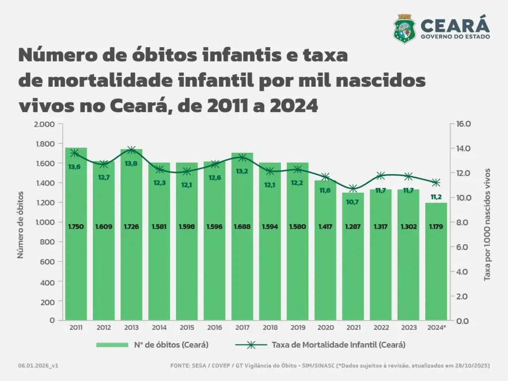 O Ceará vem registrando avanços significativos na redução da mortalidade infantil, resultado de um conjunto de políticas públicas voltadas ao fortalecimento da Atenção Primária à Saúde.