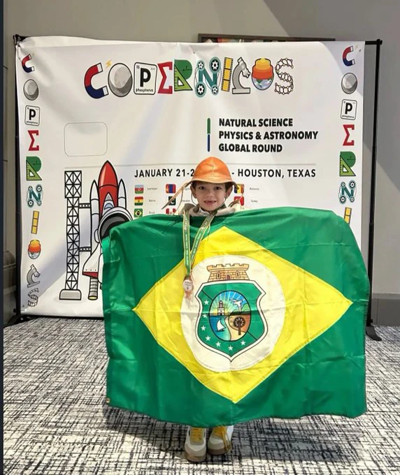 O jovem Augusto de Paula Bezerra, de apenas 8 anos, natural do Ceará e estudante da rede pública municipal de Baturité (CE), conquistou medalha de bronze na Copernicus Global Round 2026, uma das mais prestigiadas olimpíadas internacionais de ciências realizadas nos Estados Unidos.