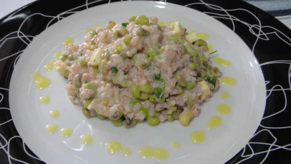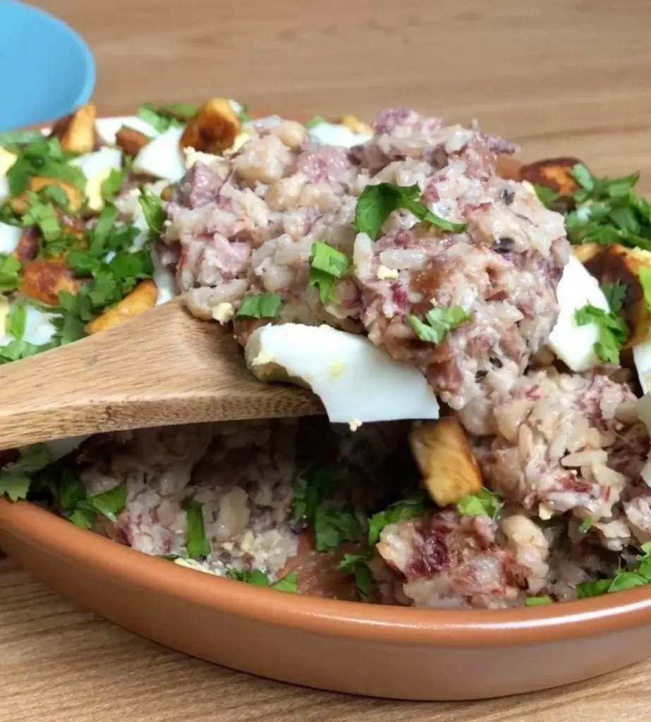- Textura cremosa ou úmida, diferente do baião-de-dois mais seco. O uso de nata, creme de leite ou requeijão é comum para dar consistência a um prato que combina arroz + feijão verde ou feijão-de-corda.