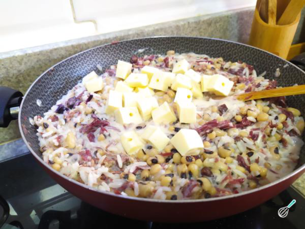 - Misture o arroz e o feijão já cozido, mexendo bem para incorporar.